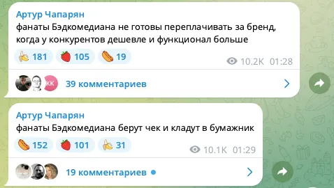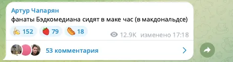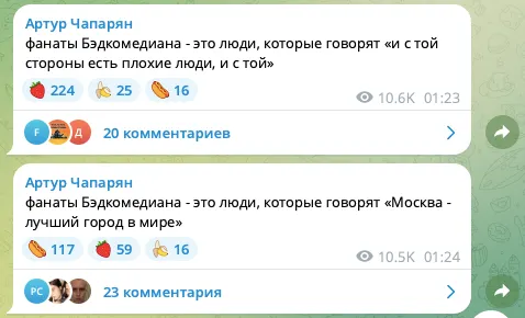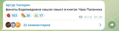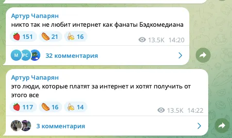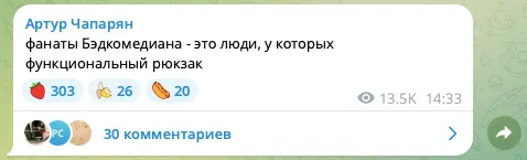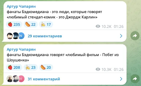 Комик Артур Чапарян напал на фанатов киноблогера BadComedian. В своем телеграм-канале бывший резидент «Что было дальше?» создает собирательный образ ядерной аудитории Евгения Баженова. Поклонники обзоров Бэда, будьте осторожны: есть риск узнать в этих постах себя.