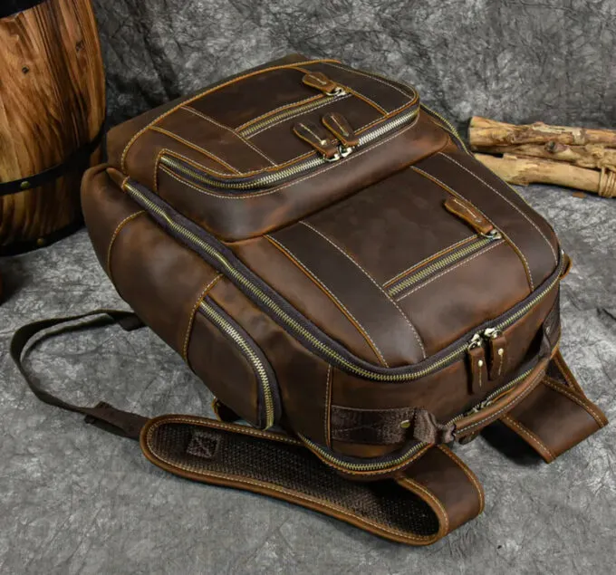 Вариант для персон с запросами. Рюкзак изготовлен из натуральной кожи, которая местами специально состарена и немного затерта. Есть ощущение, что он будет служить много-много лет. Отделений — большое количество. На выбор есть 13 вариантов расцветки, но коричневый кажется самым удачным.