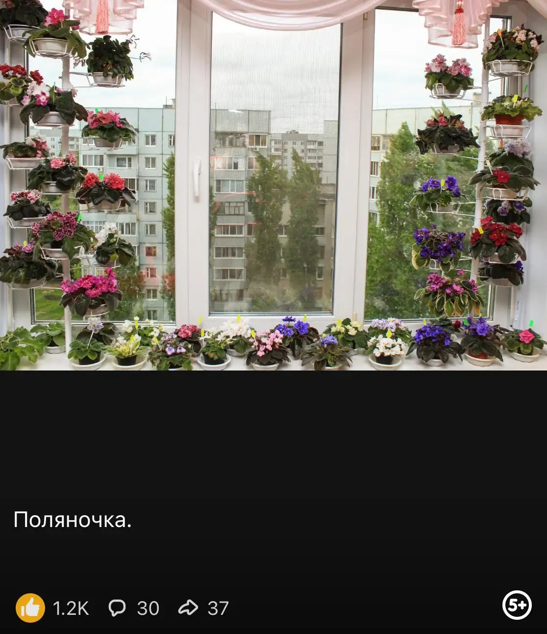 Вот этот пост — фотография красиво расставленных фиалок на окне. 1,2 тысячи лайков. Ой, то есть «классов»!