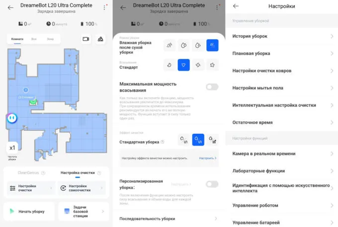 Все остальное, включая мощность всасывания, эффект зачистки и поведение робота при виде ковров, можно настроить с помощью приложение DreameHome. Апп очень удобный и интуитивно понятный.