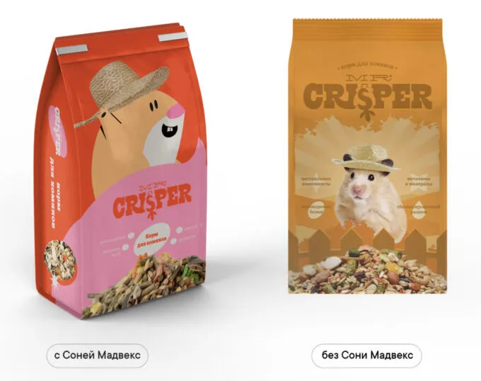 Мадвекс предложила милый мультяшный образ хомяка в шляпе, но после ее ухода компания выбрала совсем другое. На упаковку поместили фотографию настоящего, а не нарисованного, питомца, тоже надели на него шляпу и высыпали перед ним кучу корма.