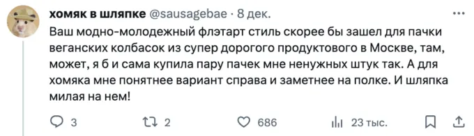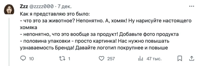 Мем случайно запустила в стратосферу дизайнер Соня Мадвекс. Девушка рассказала, что стремный дизайн, который встречается на упаковках продуктов — не всегда вина креативной команды. Дама призналась, что работала креативным директором, ее последним проектом оказалась упаковка корма для грызунов.