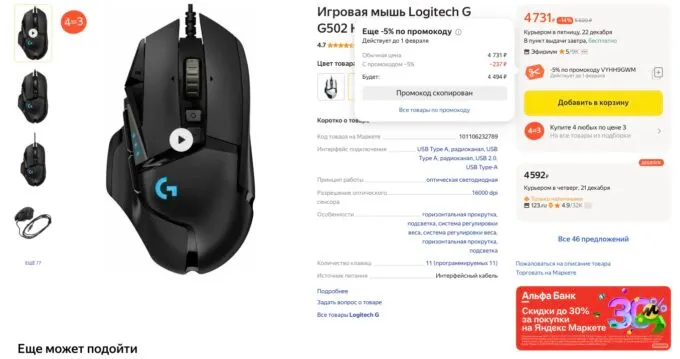 Сейчас на Яндекс Маркете можно купить топовую мышь Logitech G G502 Hero всего за 4494 рубля по промокоду VYHH9GWM, а с кэшбеками некоторых банков она обойдётся дешевле 4 косарей.