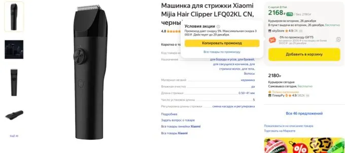 Прямо сейчас машинку для стрижки Xiaomi Mijia Hair Clipper можно урвать на Яндекс Маркете всего за 2080 рублей по промокоду GIFT5 и получить кэшбек до 15% в некоторых банках.