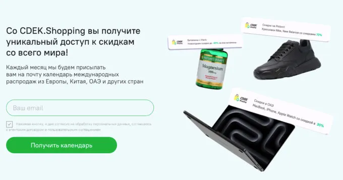 И если у вас нет времени и сил следить за всем, что происходит в зарубежном ритейле, то можно просто воспользоваться функцией «Календарь акций» на той же платформе. Суть проста: вы оставляете свой адрес электропочты на специальной странице, а затем вам каждый месяц будут присылать календарь международных распродаж из Китая, ОАЭ и европейских стран.