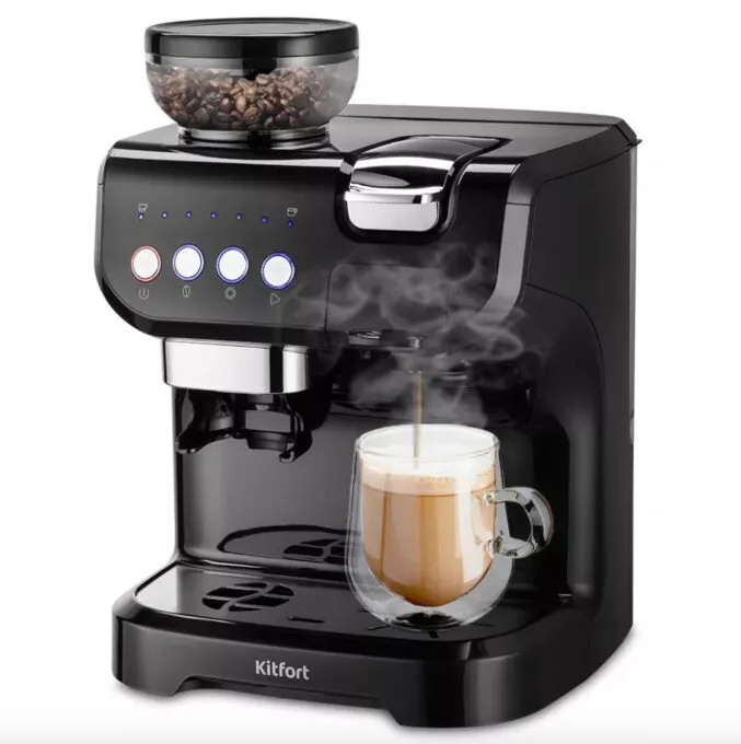 Это очень универсальная штука. Во-первых, она может молоть зерна и варить кофе. Во-вторых, поддерживает капсулы Dolce Gusto и Nespresso Original: можете просто купить расходники и варить кофе таким образом. Управление очень простое, всего 4 кнопки. Большого объема резервуара (2 литра) хватит на несколько порций.