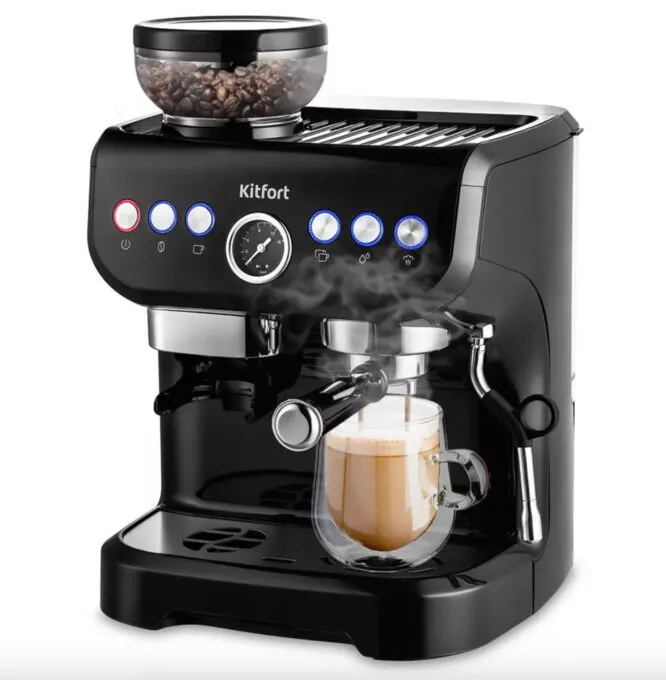 Здесь нет кофемолки, но присутствует автоматический капучинатор. Кофе можно готовить из молотой смеси и с помощью капсул Dolce Gusto и Nespresso. Устройством можно управлять через приложение. Управление довольно простое: 7 кнопок, которые отвечают за приготовление конкретного напитка и технические функции. Эспрессо понравился, напитки с молочной пеной также получили отметку «отлично».