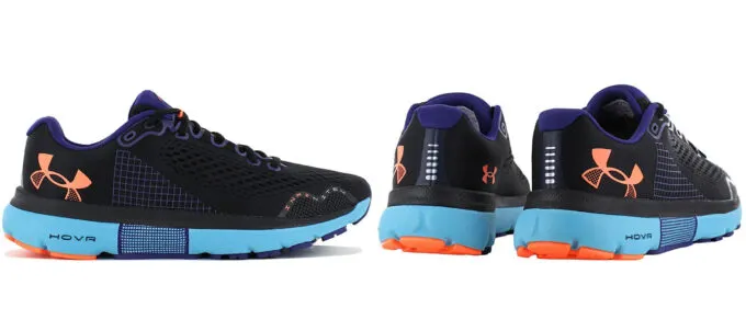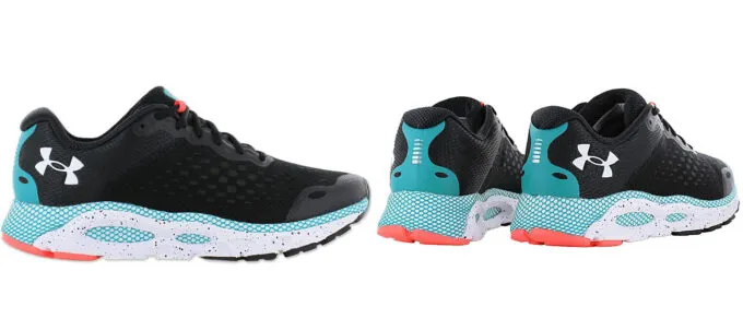 Второй айтем – черные Under Armour HOVR Infinite 3. Это беговые кроссовки, созданные для марафонов. Фишка модели – уже известная нам промежуточная подошва HOVR, отвечающая за амортизацию и комфорт. Верх из дышащая сетка прилагается, а подошву украшают вставки из углеродистой резины. Они же обеспечивают дополнительное сцепление с дорогой и износостойкость.