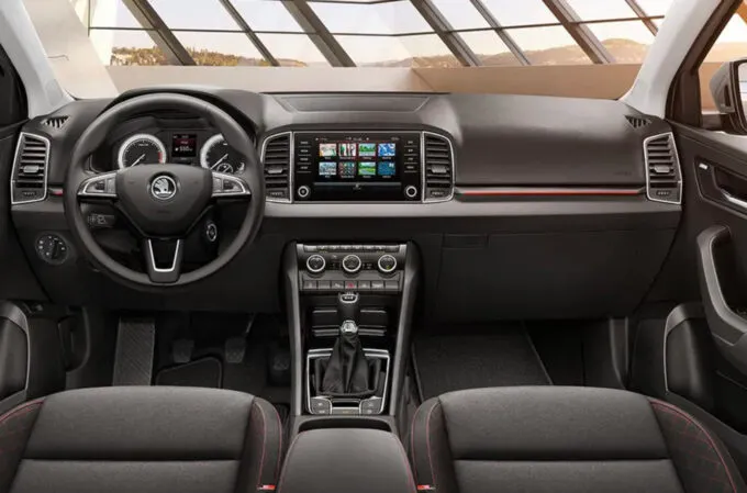 Приятный момент — даже в базовой версии автомобиль имеет богатое оснащение. Стартовый Karoq получил подогрев передних сидений и зеркал, двухзонный климат-контроль, цифровую приборную панель, парктроники, камеру заднего вида, мультируль, кожаные сиденья, панорамную крышу.