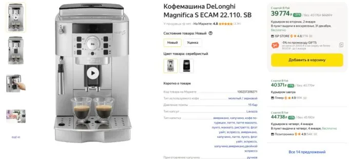 Сейчас на Яндекс Маркете кофемашину De’Longhi Magnifica S можно купить всего за 38 160 рублей по промокоду GIFT5, а с кэшбеком некоторых банков вам вернётся ещё до 3 косарей.