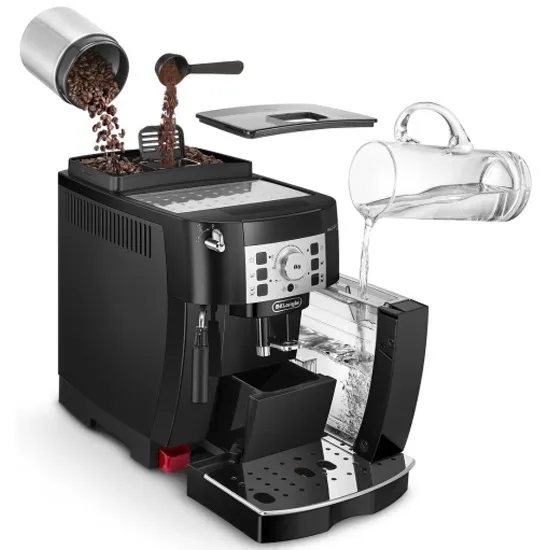 Если коротко, De’Longhi Magnifica S ECAM 22.110 — автоматическая кофемашина с ручным капучинатором, с помощью которой можно приготовить кучу разновидностей бодрящего напитка за считаные секунды. Качество нашего лота на очень высоком уровне, поскольку собираются девайсы этого бренда на заводах в Италии и Румынии. Там наверняка знают толк в кофеварении.