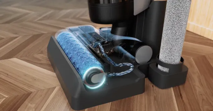 Отдельного внимания заслуживает функция самоочистки. Ее можно врубить, когда пылесос находится на базе. Роликовая щетка вращается в разные стороны, получает воду из контейнера и очищает себя самостоятельно. После этого H12 Dual запускает сушку роллера горячим воздухом.
