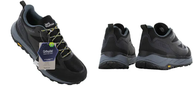 Какие кроссовки получили скидки? Первый лот – черные Jack Wolfskin Terraventure Texapore Low M. Это водонепроницаемые кроссовки, созданные для прогулок в любую погоду. Тут и сверхводостойкая мембрана Texapore Ecosphere, и амортизирующая стелька Ortholite, и прочная резиновая подошва.