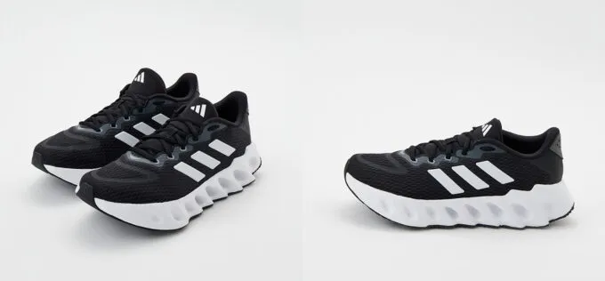 Переходим к моделям. Первый лот – черно-белые adidas Switch Run M. Это текстильные кроссовки, созданные для занятий спортом. Они очень легкие и удобные, а устойчивость обеспечивает технологичная подошва Adiwear. Отдельного внимания заслуживает минималистичный дизайн.