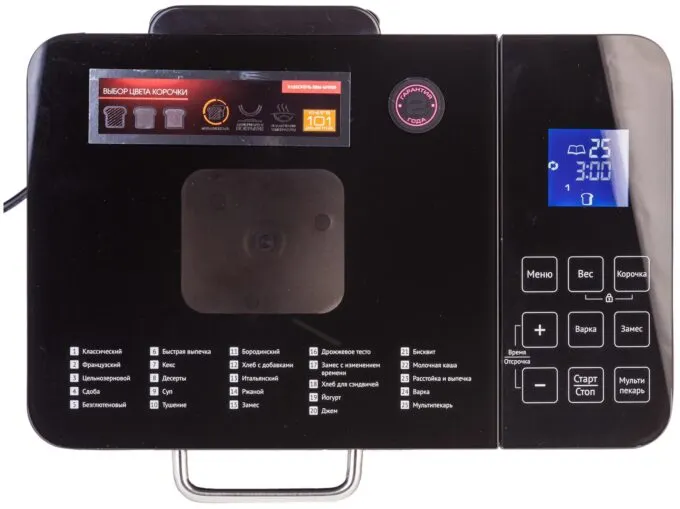 Количества программ Redmond RBM-M1909 вполне хватит, чтобы пробовать новый вид хлеба каждый день. Всего их 25, включая спецпрограммы для выпечки цельнозернового, ржаного, безглютенового, французского и бородинского хлеба. В комплекте идёт книжка с рецептами, где расписаны подробные пропорции всех ингредиентов. Промахнуться тут нереально. При желании можете использовать собственные рецепты или добавлять орешки, изюм или даже маршмеллоу.