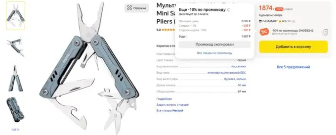 Сейчас флагманский мультитул NexTool Mini Sailor сливают на Яндекс Маркете с огромной скидкой всего за 1687 рублей по промокоду DH9EBS4Z. А с кэшбеками некоторых банков вы сможете сэкономить до 30% с покупок на этой платформе.