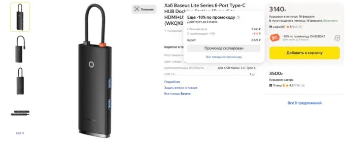 Сейчас на Яндекс Маркете топовый хаб Baseus Lite Series (WKQX050101) можно забрать всего за 2826 рублей по промокоду DH9EBS4Z. При заказе обязательно перепроверьте номер модели. У нужного нам лота — WKQX050101, другие версии отличаются отсутствием подачи питания.