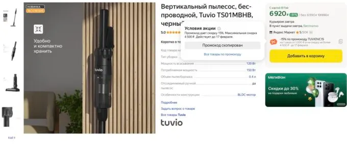 Прямо сейчас на Яндекс Маркете стильный пылесос Tuvio TS01MBHB можно урвать всего за 5940 рублей по промокоду TUVIOVC15, а с кэшбеками некоторых банков он обойдётся ещё дешевле.