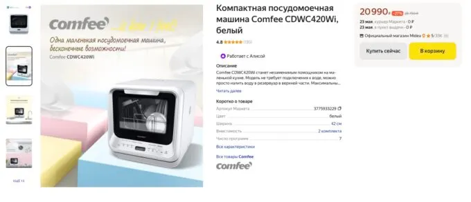 Сейчас на Яндекс Маркете умную посудомойку Comfee CDWC420Wi можно урвать за 20 990 рублей. Также не забывайте, что многие банки предлагают кэшбек до 30% с покупок на этой платформе.