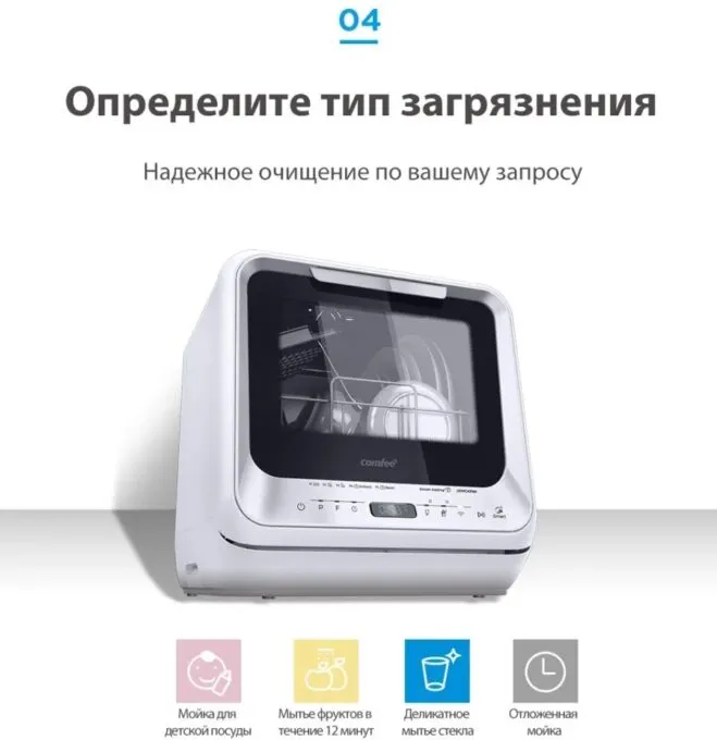 На выбор доступно 7 режимов мойки. Производитель Comfee создавал каждый из них с учётом типа посуды и степени загрязнений. Например, можно выставить деликатный режим для слишком хрупких бокалов. Даже для мамочек инженеры компании предусмотрели программу для обработки детских бутылочек. В таком режиме температура не превышает 70 градусов Цельсия.