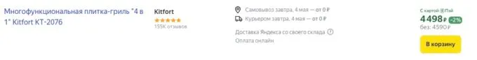 Сейчас на Яндекс Маркете плитку-гриль Kitfort KT-2076 можно купить за 4590 рублей и кэшбекнуть до 30% при оплате картами некоторых банков.