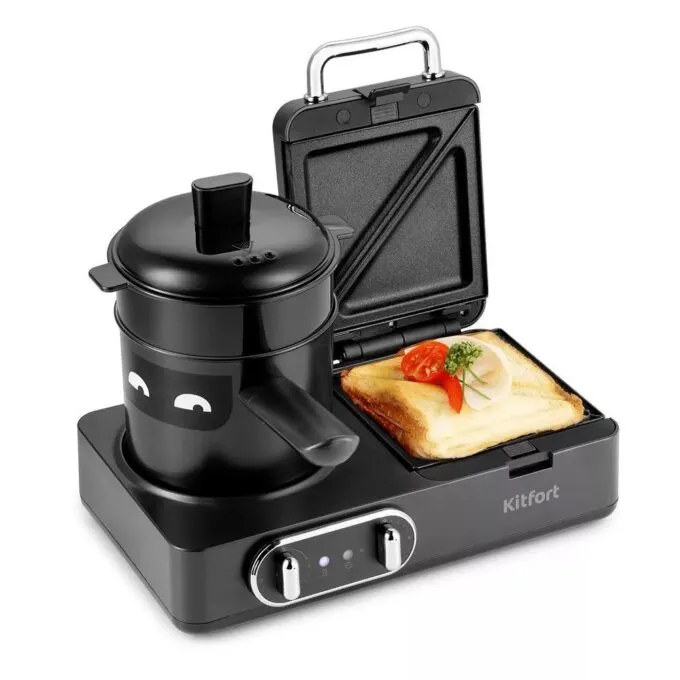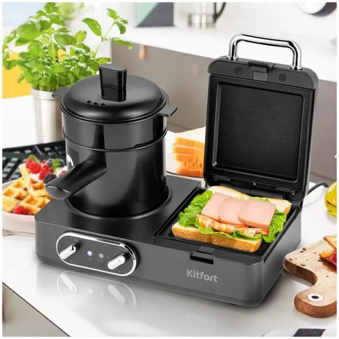 Плитка-гриль 4-в-1 от проверенного бренда Kitfort — один из немногих девайсов, которые за свою цену предлагают кучу функций. Зачастую производители техники от своей жадности стараются выпустить как можно больше устройств, чтобы вы скупили всё и обставили свою кухню. При этом их аппараты получаются довольно громоздкими. Тут мы имеем дело с компактной плитой со встроенной пароваркой, вафельницей, грилем и сэндвичницей. С такой штукой можно спокойно замутить полноценный обед с супом, котлетами, десертом и компотом.