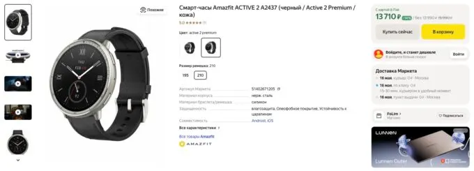Прямо сейчас премиальные Amazfit Active 2R можно урвать на Яндекс Маркете всего за 13 710 рублей. Также не забывайте, что многие банки готовы отсыпать жирный кэшбек за покупки на этой платформе.