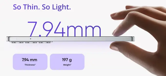 Через промоматериалы Realme очевидно замахивается на конкуренцию с iPhone Air — даже скопировали рекламное фото устройства Apple. P3 Lite достаточно тонкий (7,94 мм) и легкий (197 граммов), но не рекордно — у Air показатели покруче. Зато тут есть то, чего не имеет новый iPhone — слот под две сим-карты (у Air только eSIM) и большой аккумулятор на 6000 мАч с быстрой зарядкой 45 Вт.