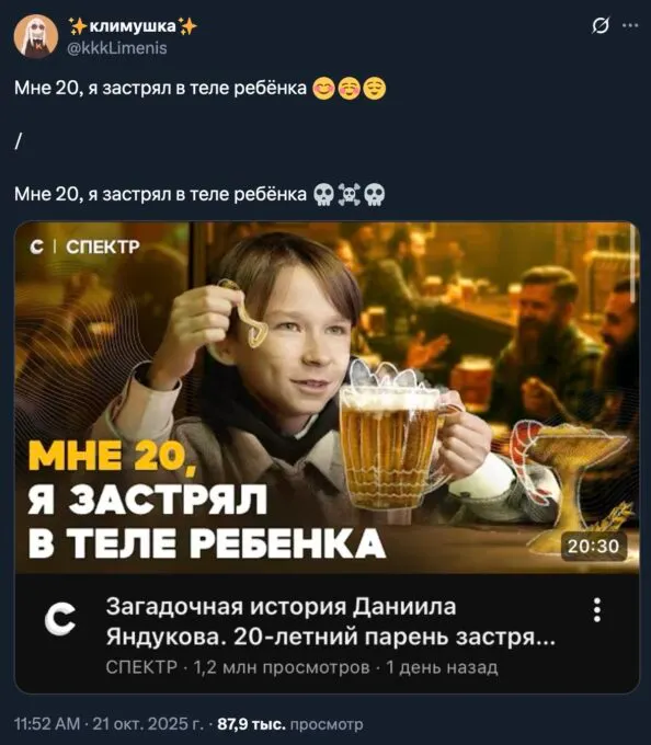 Ютуб-проект Спектр записал разговор с Даниилом Яндуковым. Это 20-летний парень, который не выглядит на свой возраст. Но он совсем не скуф, наоборот — мужчина застрял в теле ребенка.
