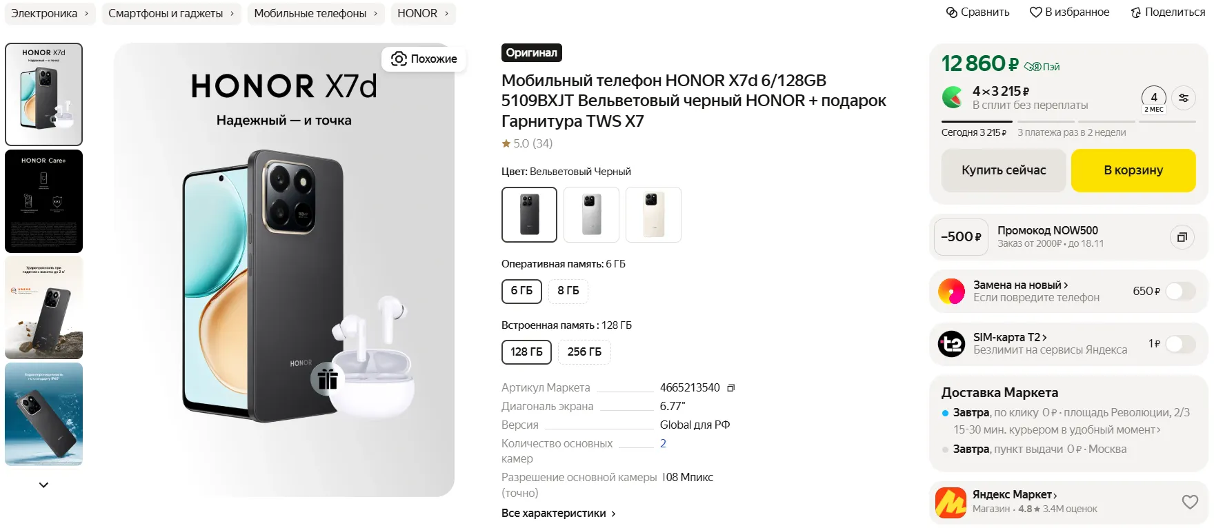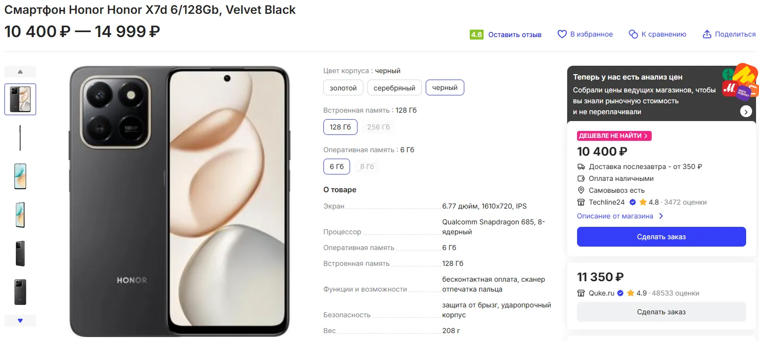 Конечно, у новинки немало недостатков: например, средние фотовозможности или невысокая производительность. Однако эти минусы простительны с учетом крайне низкого ценника — на price.ru за модель просят минимум 10 400 рублей, а на Маркете смартфон доступен за 12 990 рублей, но в комплекте идут подарочные наушники, о которых мы упомянули выше. При этом официальный прайс дикий — 18 тысяч за Honor X7d отдавать нельзя.