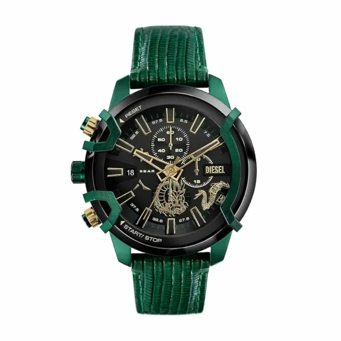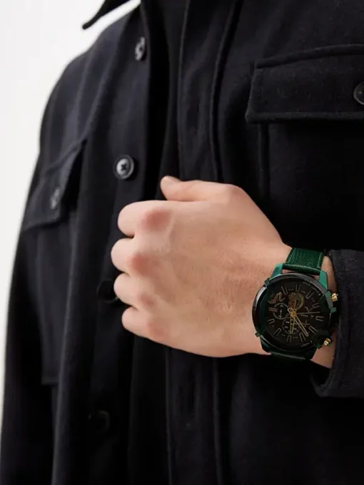 Открывает сегодняшнюю подборку максимально дерзкая модель от Diesel — Griffed DZ4651. Это брутальные часы для уверенных в себе мужчин. Такие точно не затеряются на руке. Чёрный корпус из нержавеющей стали диаметром 48 мм и кожаный зелёный ремешок создают необычный образ. Уникальная деталь — кнопки хронографа и заводная головка вынесены на левую сторону, благодаря чему часы удобно носить на правом запястье.
