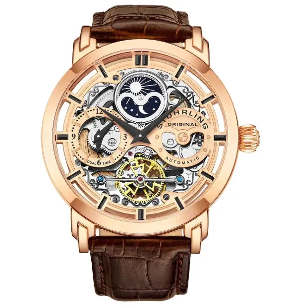 Stuhrling Legacy 3924.3 — эффектные часы-скелетоны с автоподзаводом, которые сразу привлекают внимание. Да, они максимально похожи на Breguet Tradion, которую предпочитают долларовые миллиардеры и английские лорды. Механизм калибра ST-91011 виден через открытый циферблат, что подчёркивает техническую эстетику. Стальной корпус с розовым PVD-покрытием добавляет элегантности, а ремешок из кожи завершает образ.