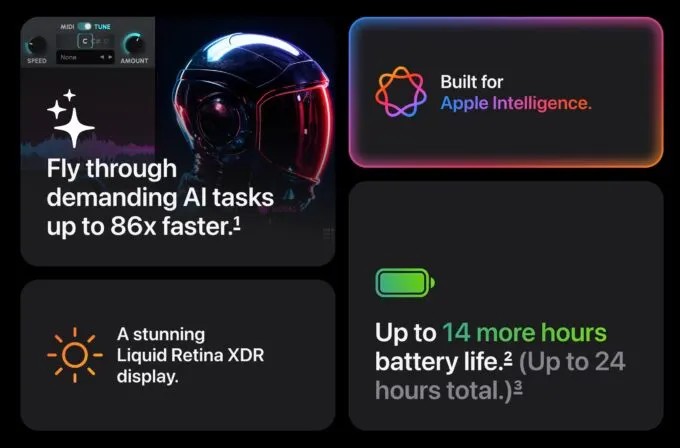 Вроде и нет серьезных отличий от девайса на M4, но в Apple заметили, что новый лэптоп может проработать до 24 часов на одном заряде (14 часов при обычной нагрузке). И это шикарно — посмотрим, что скажут обзорщики.