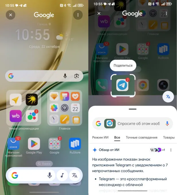 Так, в смартфоне есть функция Circle to Search. Делаешь долгий тап в нижней части экрана, появляется интерфейс Google (его сервисы тут из коробки), затем обводишь пальцем объект на экране и получаешь ответ от ИИ.