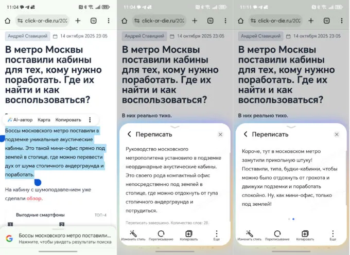 Из всего, кроме Circle to Search, я пользовался только Magic Portal и AI-письмом. При переписывании текстов довольно часто получается чепуха. Но нейросеть учится!