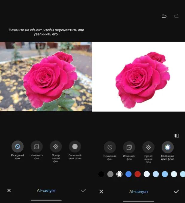 Функция AI-силуэт тоже позволяет выделять людей/предметы и отделять их — например, делать однотонную заливку или вовсе удалять фон.