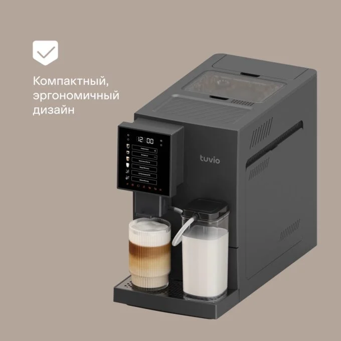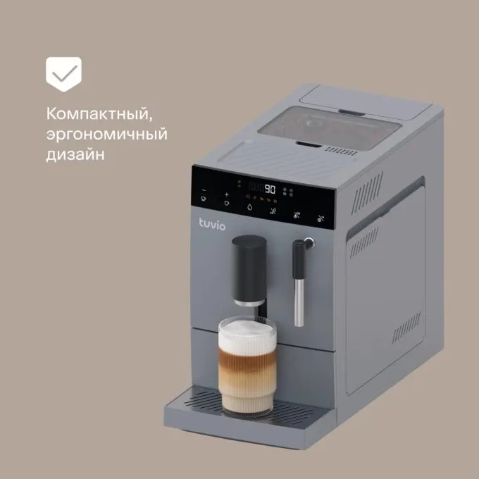 Tuvio TCM19AA — продвинутая кофемашина с большим сенсорным экраном и автоматическим управлением всеми процессами. Внешне девайс выглядит как дорогущий гаджет из будущего. Тут матовый корпус, который максимально устойчив к царапинам и отпечаткам. Интерфейс вполне интуитивный — с дисплея можно выбрать напиток, крепость, температуру, объём, степень помола и даже включить предварительное смачивание. Настроек здесь столько, что обычные кофемашины просто отдыхают.