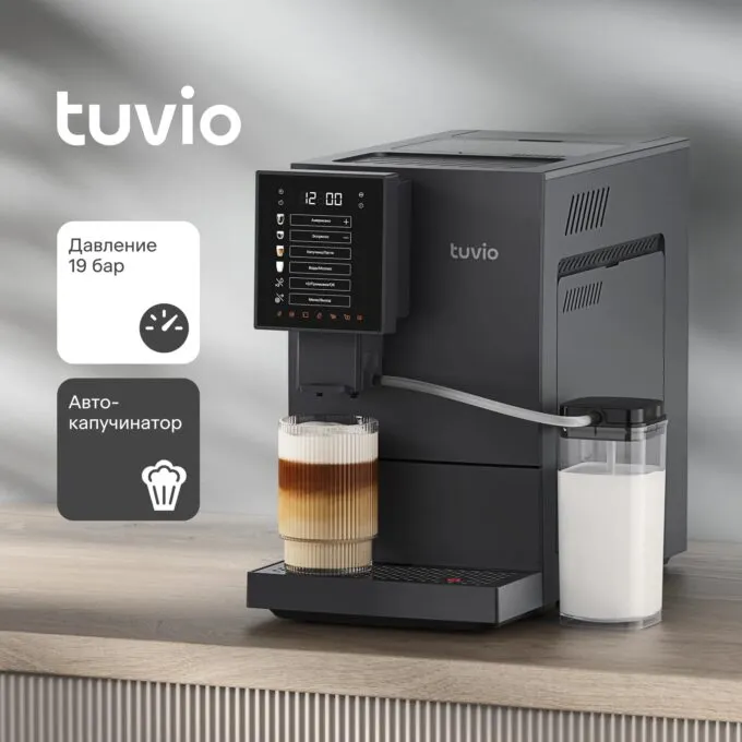 Встроенный в Tuvio TCM19AA капучинатор полностью автоматический. Для него предусмотрен отдельный контейнер на 450 мл. Зато латте и капучино готовятся одним касанием. Внутри стоит итальянская помпа ULKA на 19 бар — она раскрывает вкус и аромат каждого зерна. Машина также умеет подогревать чашки, подавать горячую воду и автоматически выключаться после простоя. После приготовления запускается самоочистка всех каналов и капучинатора, а светодиодная подсветка кружки добавляет немного уютной атмосферы. Эта модель создана для тех, кто хочет получить премиальное качество без лишних переплат.