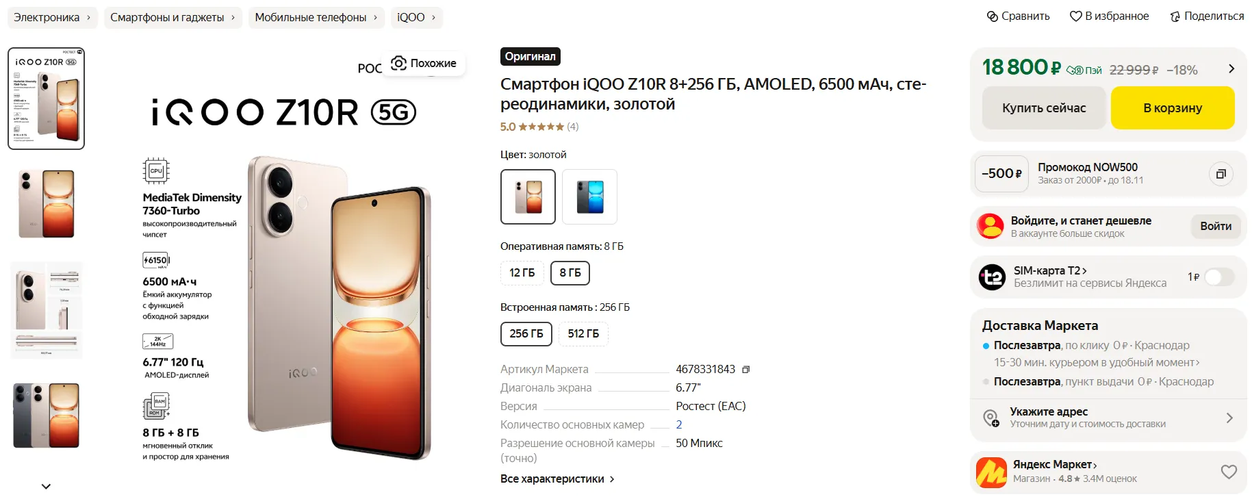 Недавно до России добрался бюджетный iQOO Z10R — месяц назад заметили появление новинки на Маркете в скидочном Телеграм-канале «Палача». Сначала за смартфон просили больше 23 тысяч, а сейчас ценник упал до 18 990 рублей.