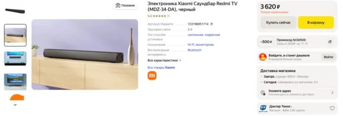Прямо сейчас на Яндекс Маркете топовую акустику Xiaomi Redmi TV Soundbar можно купить всего за 3620 рублей. А с кэшбеками некоторых банков он обойдётся дешевле.