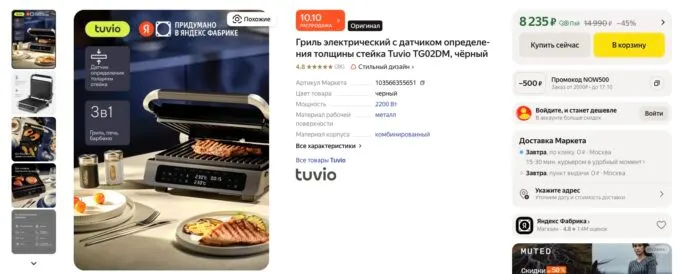 Прямо сейчас на Яндекс Маркете флагманский мультигриль Tuvio TG02DM можно купить всего за 8235 рублей. А с кэшбеками некоторых банков он обойдётся ещё дешевле.