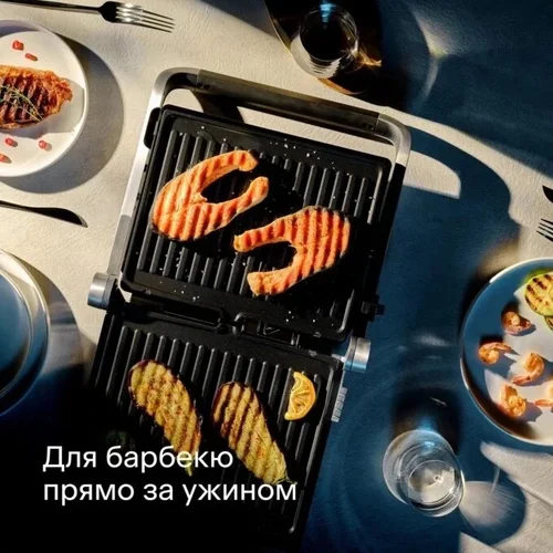 По набору функций Tuvio TG02DM — самый настоящий флагман. В нём есть три режима работы: гриль для стейков и сэндвичей, печь для пиццы и барбекю для морепродуктов и овощей. Причём нагрев верхней и нижней панелей регулируется отдельно. Съёмные антипригарные пластины можно спокойно мыть в посудомойке, а с сенсорным управлением разберётся каждый — оно тут довольно интуитивное и простое. В девайсе предусмотрены 12 автоматических программ, но есть и ручной режим для тех, кто хочет контролировать процесс полностью.