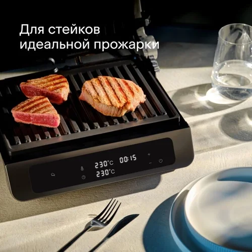 Главная особенность Tuvio TG02DM — встроенный сенсорный щуп. Он сам измеряет толщину мяса и подбирает оптимальные параметры прожарки. Никаких пересушенных стейков, недоготовленных куриц или снайперских догадок на глаз. Достаточно просто положить мясо и закрыть крышку — Tuvio TG02DM сам доведёт его до идеального состояния.
