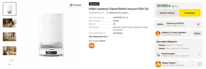 Сейчас на Яндекс Маркете флагманский робот-пылесос Xiaomi Robot Vacuum X20+ можно урвать за 39 590 рублей. А с кэшбеком некоторых банков вы сэкономите ещё больше.