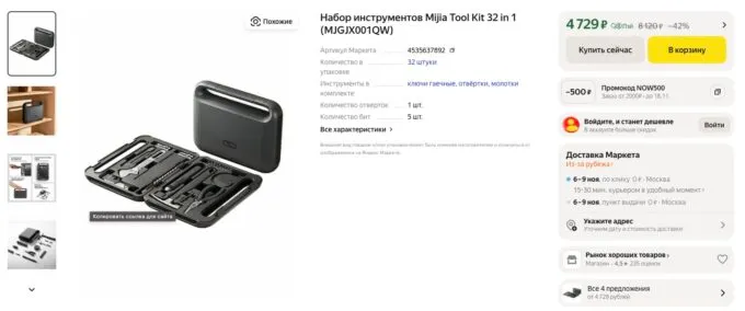 Cейчас на Яндекс Маркете солидный ремонтный набор Xiaomi Mijia Toolbox можно купить за 4729 рублей. Также не забывайте, что с кэшбеками некоторых банков она обойдётся ещё дешевле.