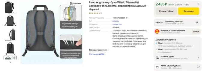 Прямо сейчас на Яндекс Маркете стильный городской рюкзак Wiwu Minimalist Backpack можно приобрести всего за 2435 рублей. А с кэшбеком некоторых банков он обойдётся ещё дешевле.