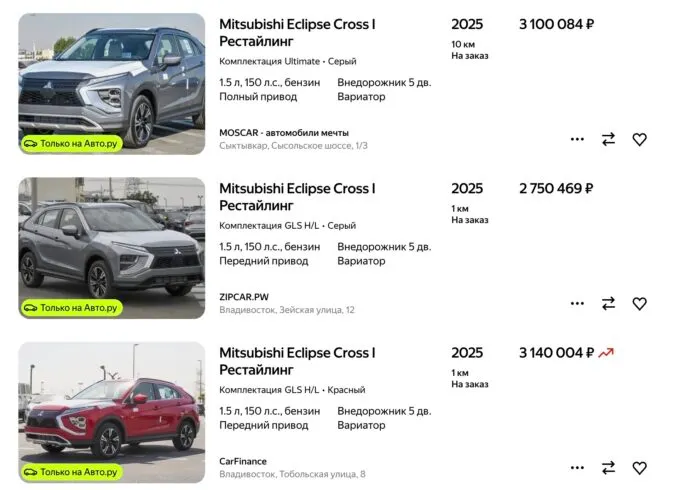Mitsubishi Eclipse Cross имеет 1,5-литровый бензиновый мотор на 150 л.с., бесступенчатый вариатор и передний или полный привод (зависит от комплектации). Самый дешевый Кросс 2025 года выпуска нашли во Владивостоке. У тачки довольно богатая комплектация — климат-контроль, мультируль, круиз-контроль, сенсорная мультимедиа, камера заднего вида и подогрев передних сидений. Цена — 2 750 000 рублей.