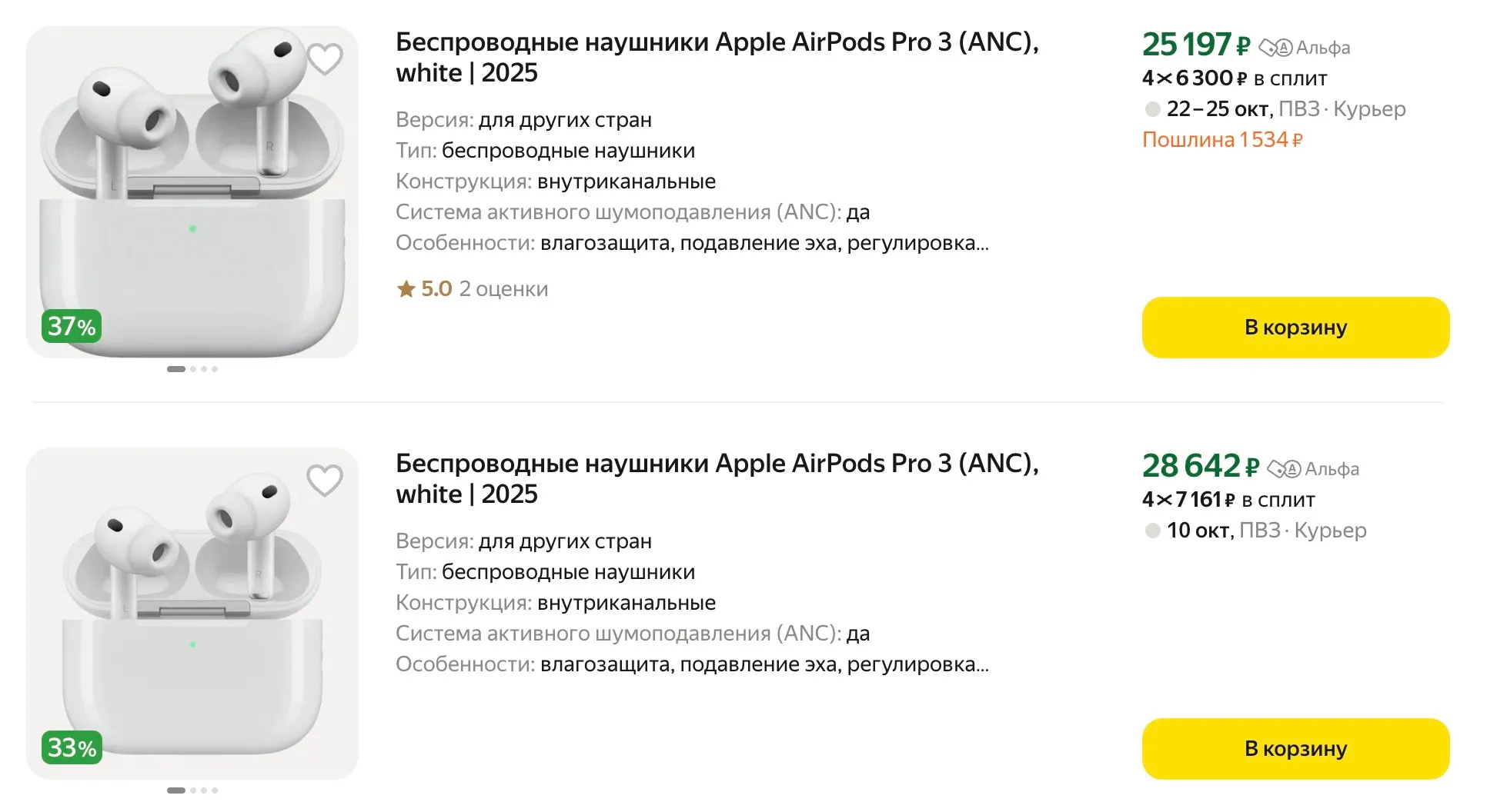 Расклад простой — спустя месяц после релиза AirPods Pro 3 можно взять в РФ за 28,6 тысяч рублей. Нам видится, что этот прайс немного завышен: адекватный ценник на новейшую гарнитуру — 25-26 тысяч рублей. С доставкой из-за рубежа (вместе с пошлиной) получается около 27 тысяч рублей. В общем, можно брать, если не жалко переплаты в 2-3 тысячи рублей.