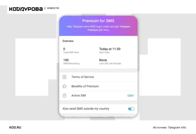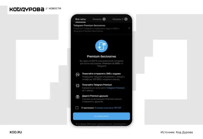 Суть фишки в том, что юзер разрешает посылать со своего номера телефона до 100 SMS в месяц. Пользователь служит ретранслятором, а как только набирает минимальное количество отправленных сообщений, получает подписку Telegram Premium.