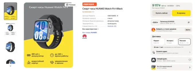 Прямо сейчас на Яндекс Маркете свежие часы Huawei Watch Fit 4 можно урвать за 9117 рублей. А с кэшбеком некоторых банков вы сэкономите ещё пару сотен рублей.